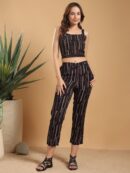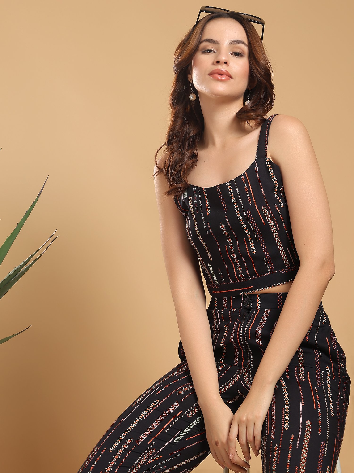 An elegant and sophisticated two-piece coord set featuring a chic black crop top with multi-colored abstract print stripes and sleeveless design with strap, paired with matching straight-fit trousers. Crafted from premium viscose rayon fabric for breathable comfort and a non-transparent finish, this ensemble showcases an eye-catching geometric pattern with metallic accents in copper, gold, and bronze tones against a rich black base. The top features a back concealed zip closure for a sleek look, while the trousers have a mid-rise fit with an elasticated waistband at the back, trousers with zip on at the front, and 2 pockets for convenience. Perfect for parties, evening wear, or making a bold fashion statement.