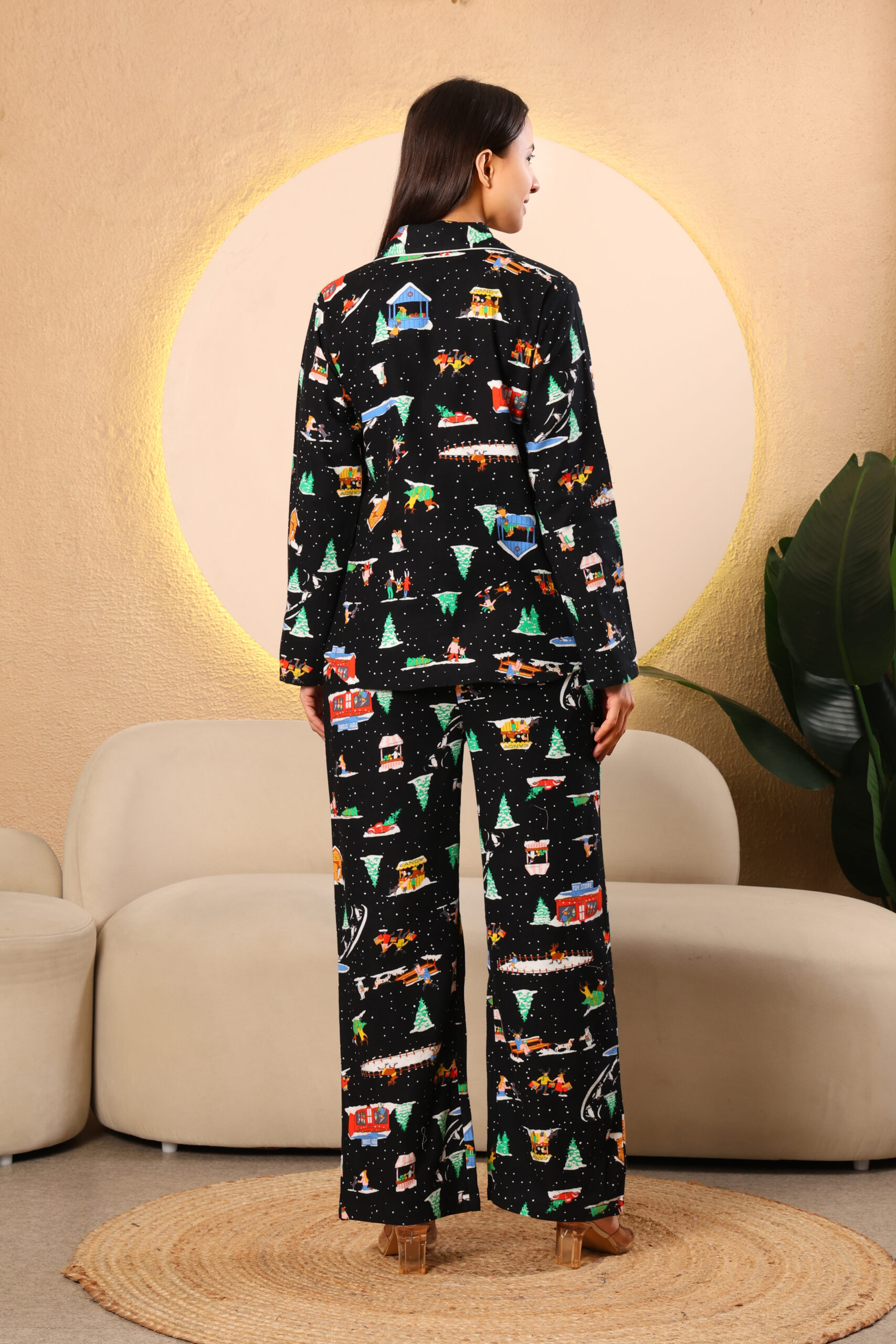 • Trousers: Black printed with abstract winter design