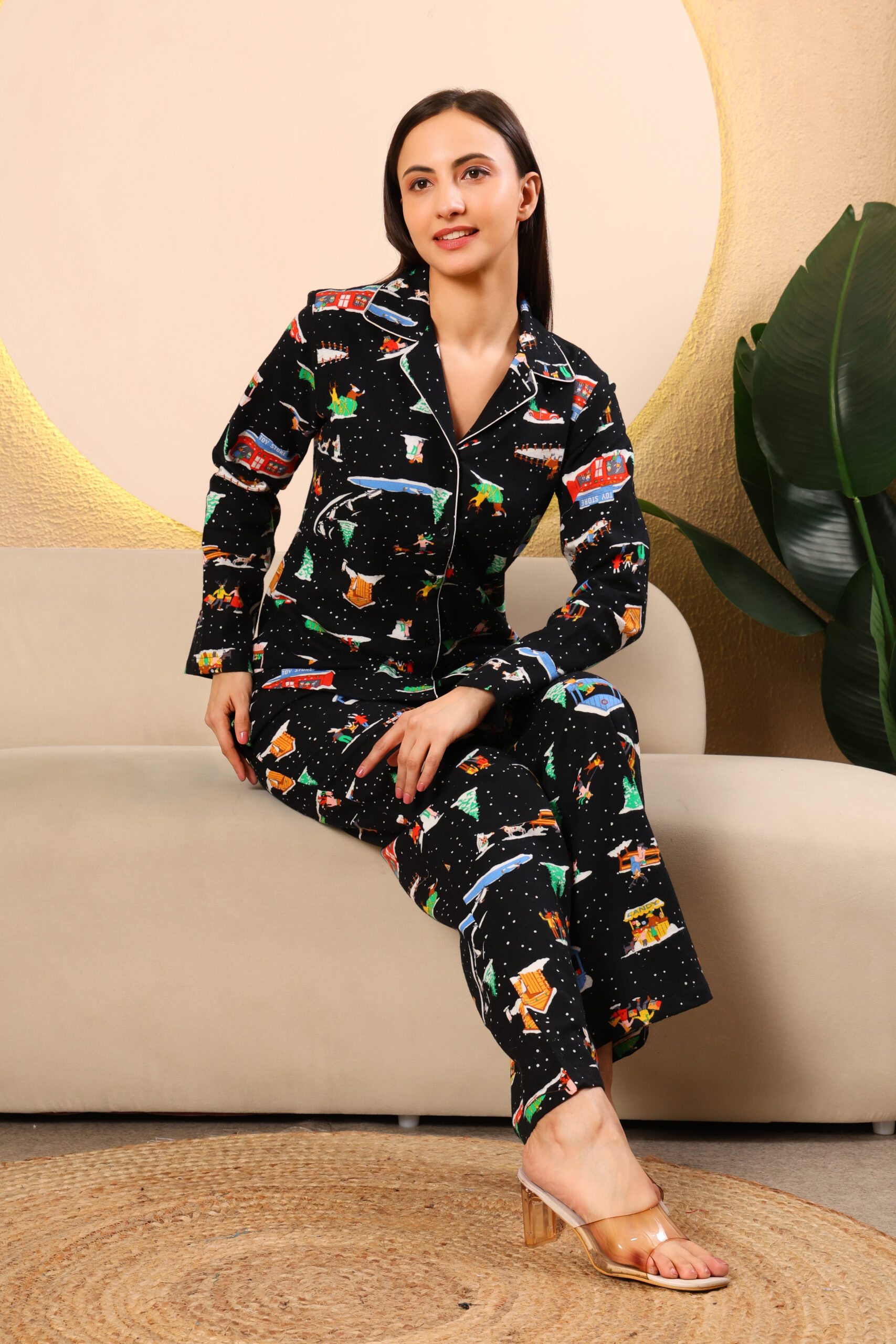 Cozy up in style with this charming black printed winter night suit featuring a playful winter wonderland design. Crafted in soft, breathable cotton fleece fabric, this delightful set includes a regular shirt-style top with a classic collar, buttoned closure, and full sleeves paired with matching printed trousers. The abstract winter-themed print showcases colorful houses, trees, and snowy scenes on a black background. With an elasticated waistband and 2 functional pockets, this comfortable night suit is perfect for chilly winter nights and relaxed lounging at home.