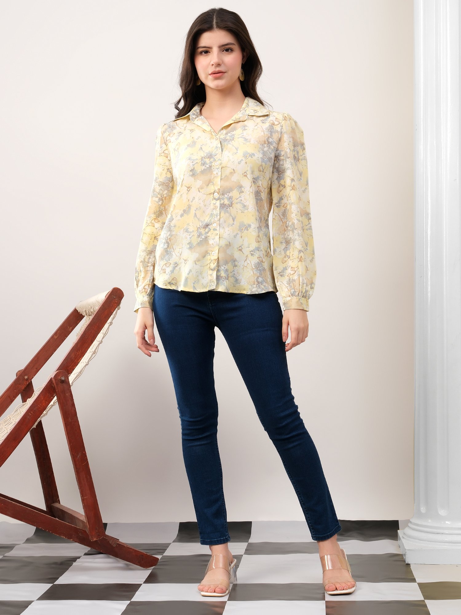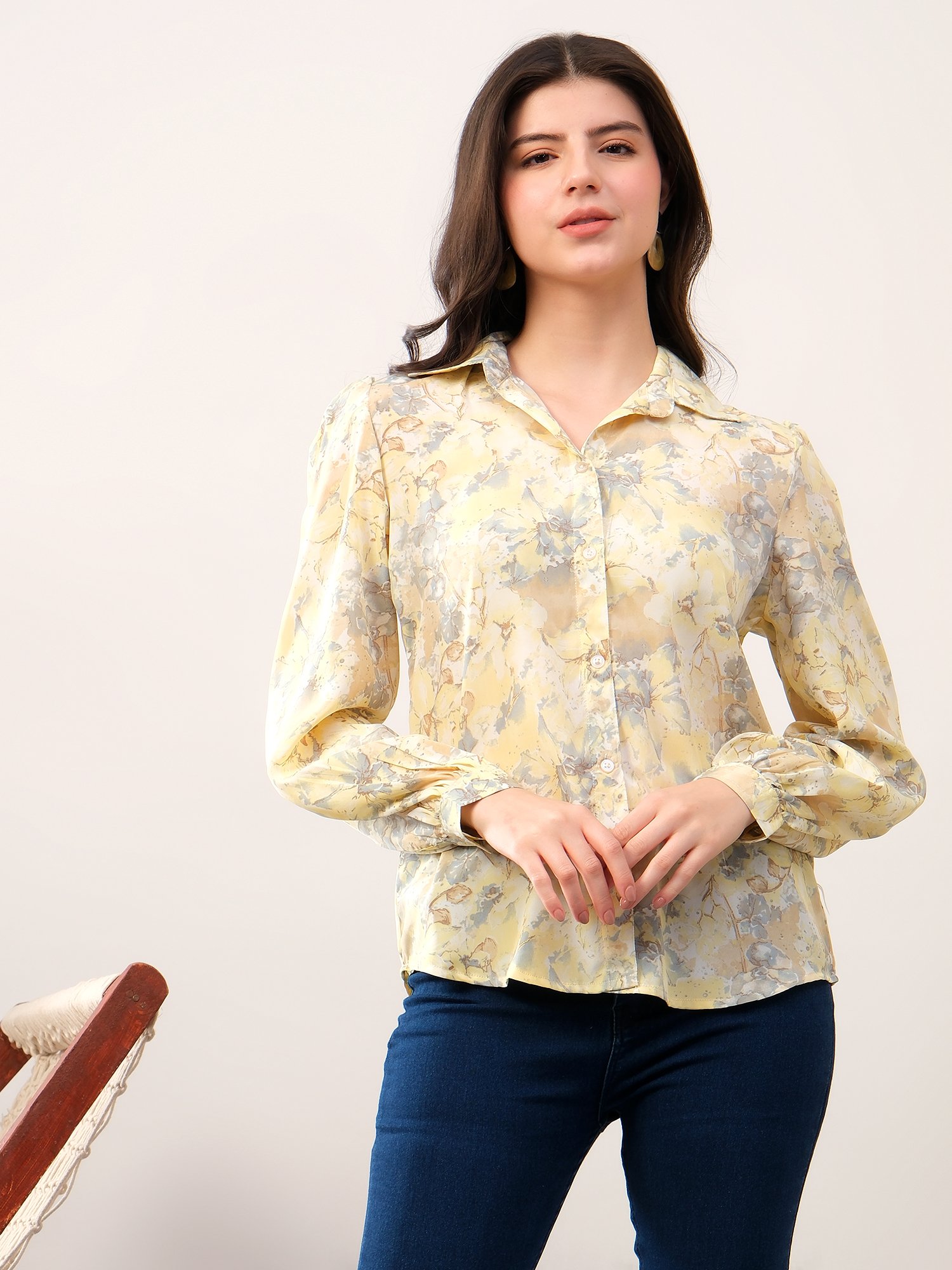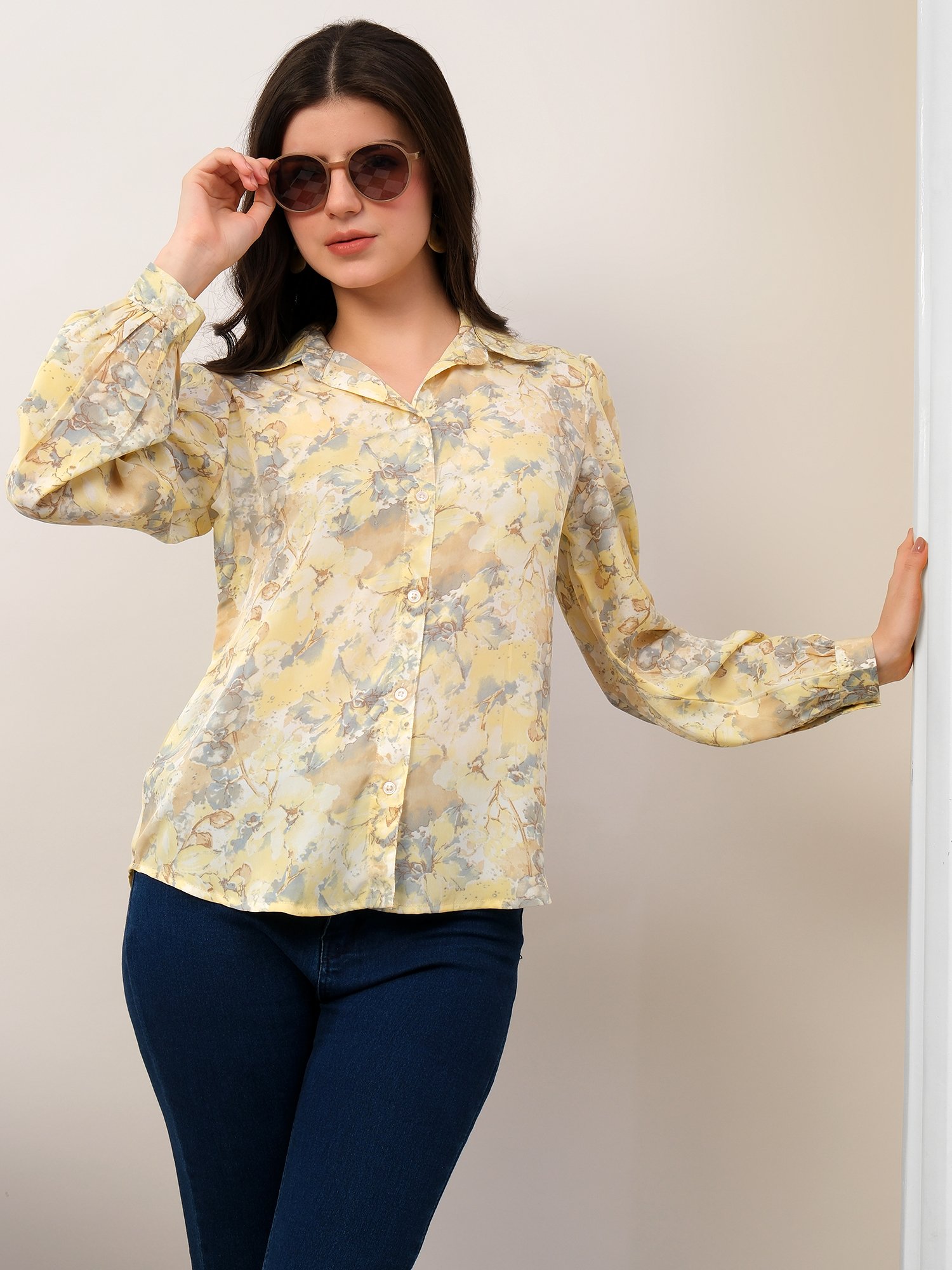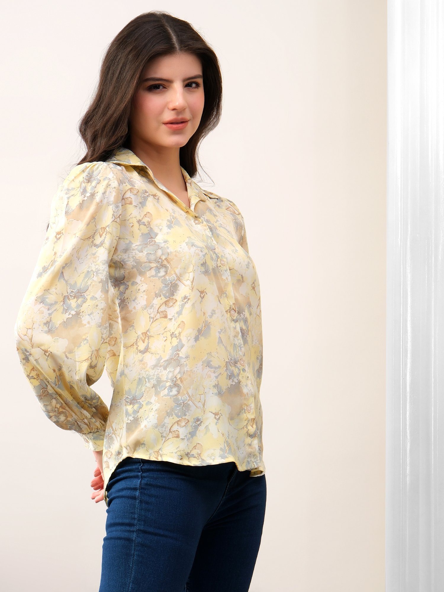 A timeless wardrobe essential crafted in soft crepe silk. This pastel yellow floral printed shirt offers a lightweight, breathable feel with a refined silhouette, designed for effortless everyday elegance.